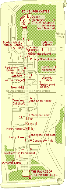 Lediglich zum Osten neigt sich der Berg gemächlich bis zum Holyrood House, dem Palast Mary Stuarts und heutigen Sitz der englischen Royals, wenn sie sich in Edinburgh aufhalten. Die Straße zwischen Castle und Palace ist die Royal Mile. Hier reiht sich Laden an Laden, und historische Sehenswürdigkeiten sind aufgereiht wie Perlen an einer Schnur. Durch kleine Gassen kann man dem Trubel dieser Straße in Hinterhöfe entfliehen, und durch ein Gewirr von Durchgängen, Treppen und Höfen kann man im Norden wie im Süden zum Fuße des Berges gelangen.