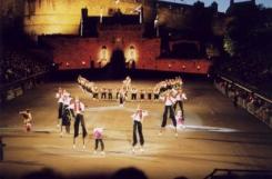Bei der Esplanade handelt es sich um einen großen Platz am oberen Ende der Royal Mile, unmittelbar vor dem Castle, die seit Mitte des 18. Jahrhunderts als Exerzierplatz dient. Auf diesem Platz werden zum August in U-Form steil aufragende Tribünen errichtet, wobei das Castle die natürliche Kulisse des Spektakels liefert. Auf dem nebenstehenden Foto kann man rechts das Castle und links davon - mit etwas Mühe - die Tribüne erkennen.